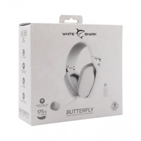 Micro Casque Gamer WHITE SHARK BUTTERFLY – Connectivité: Sans Fil – Interface: BT – Diamètre de Haut-parleur: 40 mm – Gamme de fréquences: 20 – 20 000Hz – Sensibilité Casque/Microphone: 103 +/- 3 dB/-42 +/- 3 dB – Impédance Casque/Microphone: 32 +/- 15% Ohm/<=2200 Ohm – Matériau: Plastique,textile – Avec Microphone détachable et Omnidirectionnel – Interrupteur marche/arrêt pour le microphone, interrupteur marche/arrêt pour les écouteurs, commandes de volume – Compatible avec les appareils PC, PS4/5, XBOX, MAC – Dimensions du microphone: 6 x 5 mm – Poids: 175 g – Dimensions: 190 x 73 x 193 mm – Couleur: BLANC – Garantie 3 MOIS