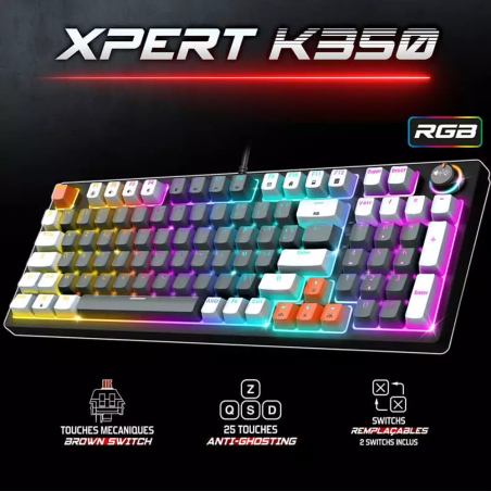 Clavier Gamer SPIRIT OF GAMER XPERT K350 – Technologie de Connectivité: Filaire – Interface: USB – Type de Clavier: Mécanique – Norme du clavier: AZERTY – Nombre de Touches: 97 Touches – Rétroéclairage RGB(11 modes) – Switchs mécaniques marron – Longueur du câble: 1,5 mètre – Dimensions: 38,5 x 13,6 x 3,5 cm – Poids: 720 g – Couleur: Gris – Garantie: 3 mois