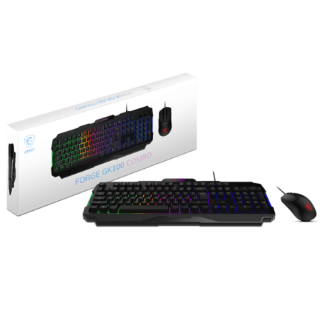 Ensemble Clavier et Souris Gaming COMBO MSI FORGE GK100 + MSI FORGE GM100 – Clavier Gaming MSI FORGE GK100 – Interface: USB 2.0 – Rétroéclairage RGB – Type de commutateur: Membrane – Vie de Coupe de Clé: 10 millions – 108 touches – 19 clés ANTI-FANTÔME – LONGUEUR DU CÂBLE: 1.5 métre – DIMENSIONS: 454 x 186 x 40 mm – POIDS: 756 g – Couleur Noir / Souris Gaming Filaire MSI FORGE GM100 – Interface: USB 2.0 – Type de capteur: Optique – DPI COMMUTABLE PRÉRÉGLÉ: 1000 / 1600 / 3200 / 6400 DPI – TYPE DE COMMUTATEUR: Micro-interrupteur – DURABILITÉ DU COMMUTATEUR: 10 millions de clics – 7 BOUTONS – LUMIÈRE LED: 6 modes RGB – LONGUEUR DU CÂBLE: 1.5 métre – DIMENSIONS: 120 x 60 x 40 mm – POIDS: 108 g – Couleur Noir – Garantie 1 an