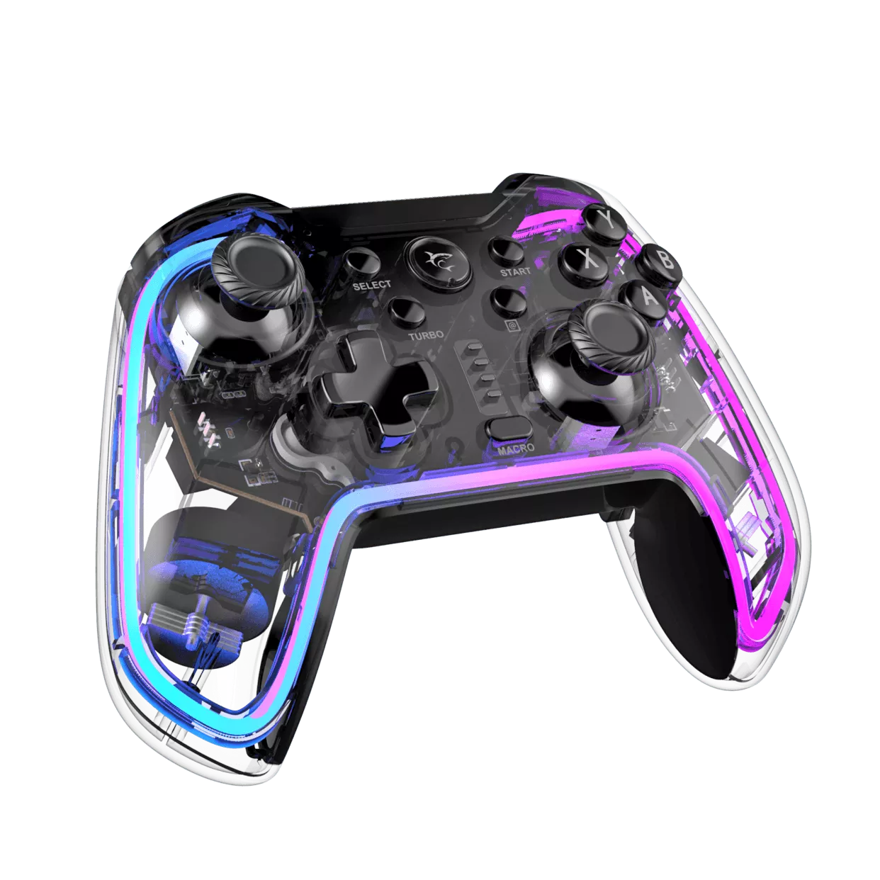 ✨ Conçue pour le confort et la précision, cette manette gaming arbore une coque transparente futuriste et un éclairage RGB qui brille dans le feu de l’action. Elle intègre 19 boutons, un D-pad réactif, deux sticks analogiques fluides et une fonction de vibration double moteur pour ressentir chaque explosion, choc ou virage serré 🚀🎯.