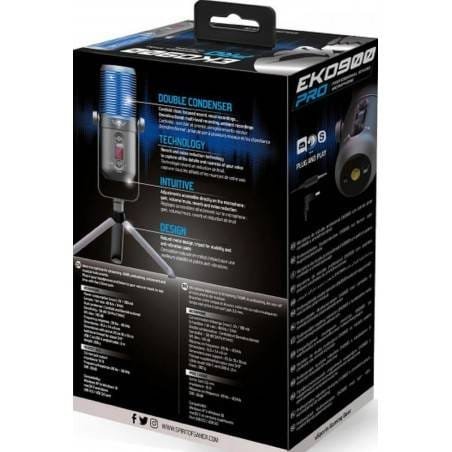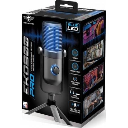 Microphone Spirit Of Gamer EKO-900 Rétro-éclairé Bleu, Trépied, Sensibilité: -38 dB (+/-3dB), Fréquence: 20 Hz ~ 20 KHz, Boutons: Cardïod – Omnidirectionnel – Off / Reverb / Réduction de bruit / Volume, Connexion: Port USB 2.0 / USB 3.0, câble coudé USB-C vers USB-A (2 m), Directivité: Cardioïde Omnidirectionnel – Poids: 380gr – Garantie: 3 mois