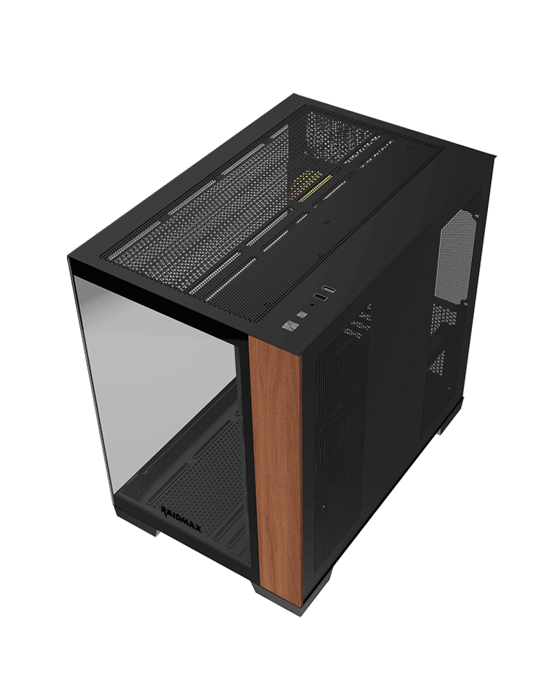 Le Raidmax Infinita i610 Wood Noir est un boîtier PC gaming qui se distingue par son design dual-chamber moderne avec finition bois élégante, apportant une touche premium et originale à votre setup.
