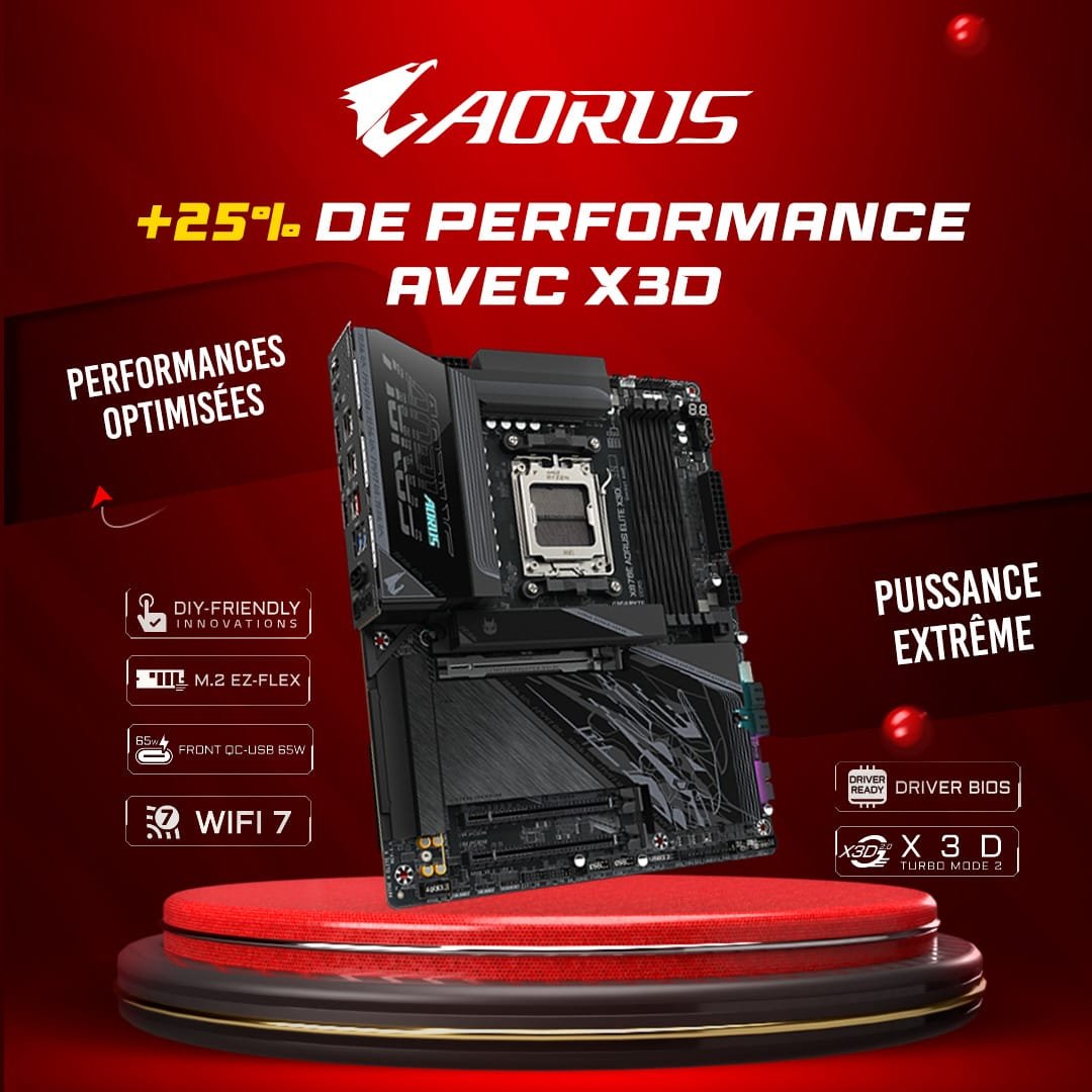 La X870E AORUS ELITE X3D est une carte mère haut de gamme AM5 conçue pour exploiter tout le potentiel des processeurs AMD Ryzen™ X3D. Elle combine des performances extrêmes, une connectivité moderne et une stabilité premium.