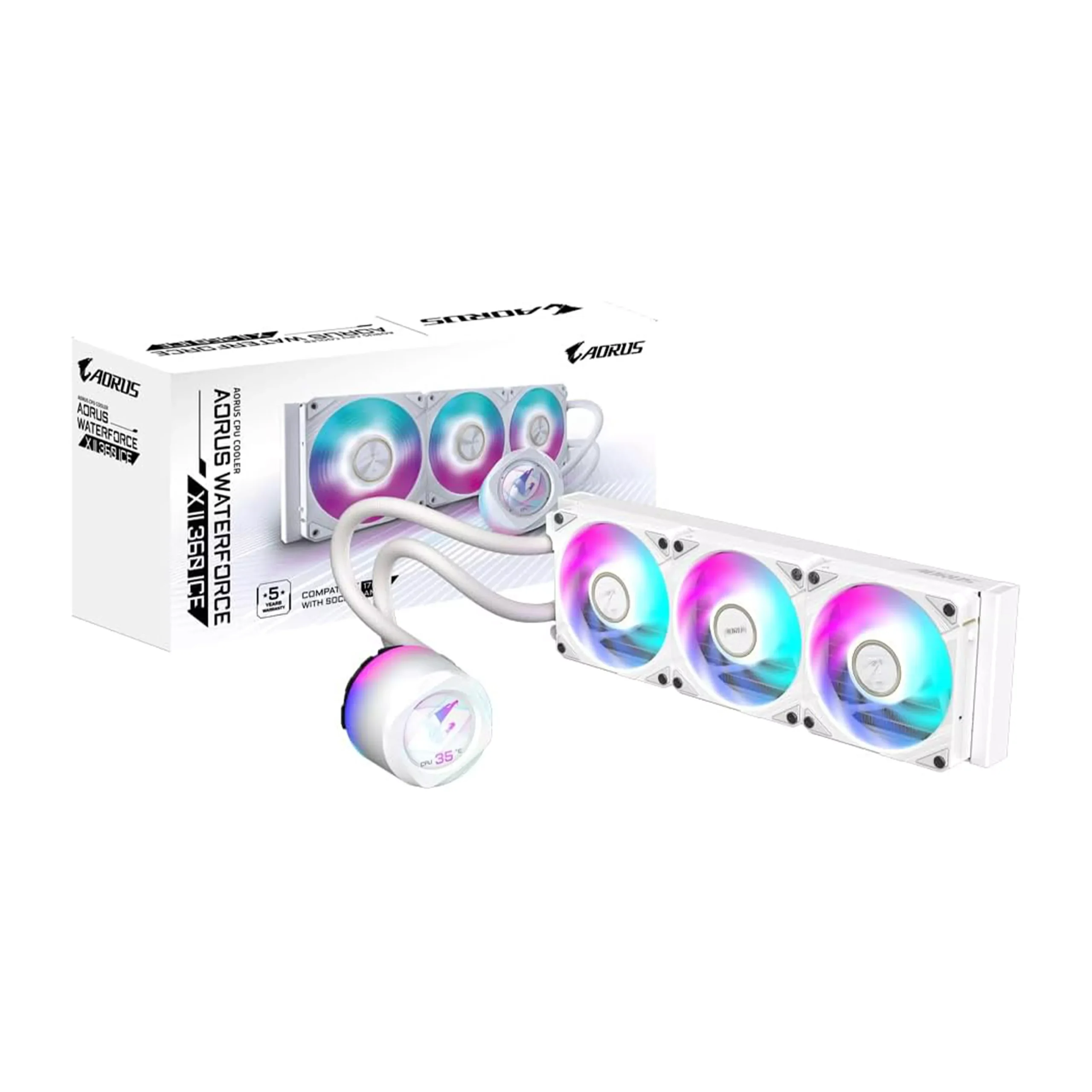 L’AORUS WATERFORCE X II 360 ICE est un refroidisseur liquide pour processeur conçu pour offrir des performances de refroidissement exceptionnelles. Il est équipé d’un radiateur de 360 mm et de trois ventilateurs ARGB de 120 mm à faible bruit, ce qui assure une dissipation thermique efficace et une réduction du bruit. Ce système est compatible avec les sockets Intel LGA1700 ainsi que les sockets AMD AM5, TR4, AM4, et sTR5, offrant une grande polyvalence pour différents types de cartes mères.