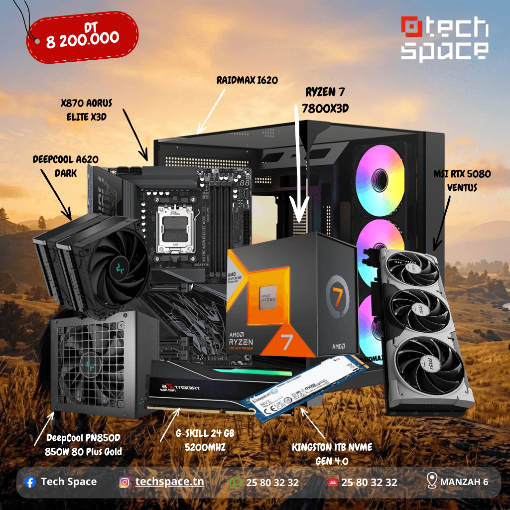 You're viewing: RYZEN 7 7800X3D | RTX 5080 | 24GB RAM DDR5 | 1TB GEN 4.0 8.200,000 TND