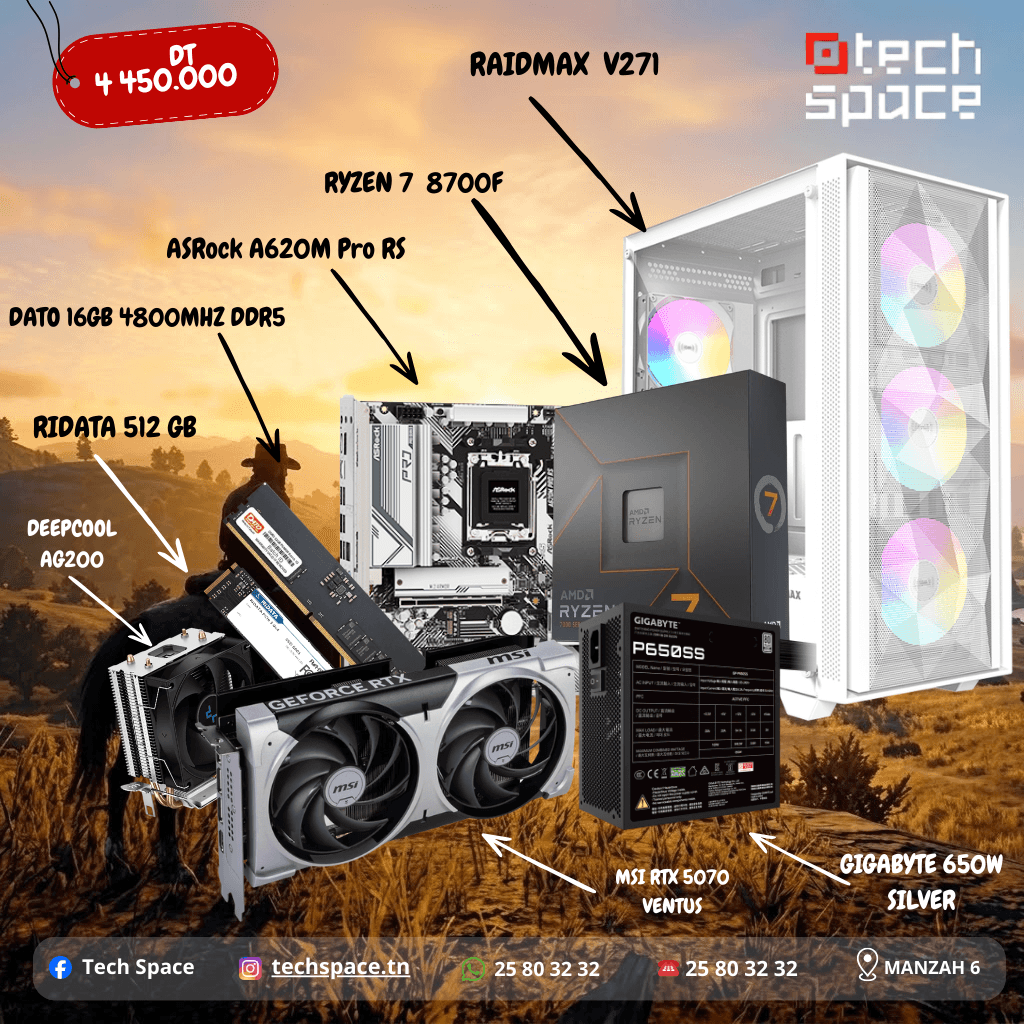 You're viewing: RYZEN 7 8700F | RTX 5070 | 16GB RAM DDR5 | 512 GB 4.450,000 TND