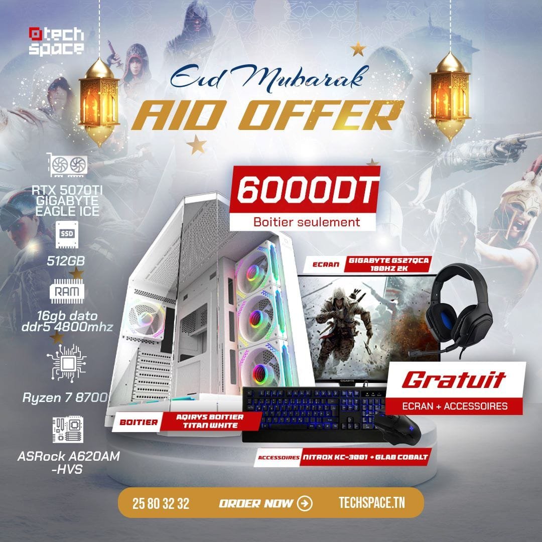 Vivez une expérience gaming exceptionnelle durant cette période de l’Aid. Équipé d’un processeur Ryzen 7 8700, de la puissante carte graphique Gigabyte RTX 5070 Ti Eagle ICE et d’une carte mère ASRock A620A-HVS, ce setup offre une fluidité parfaite pour vos titres compétitifs favoris. Le boitier AQIRYS TITAN WHITE et l’écran Gigabyte inclus en font la configuration idéale pour faire la fête.