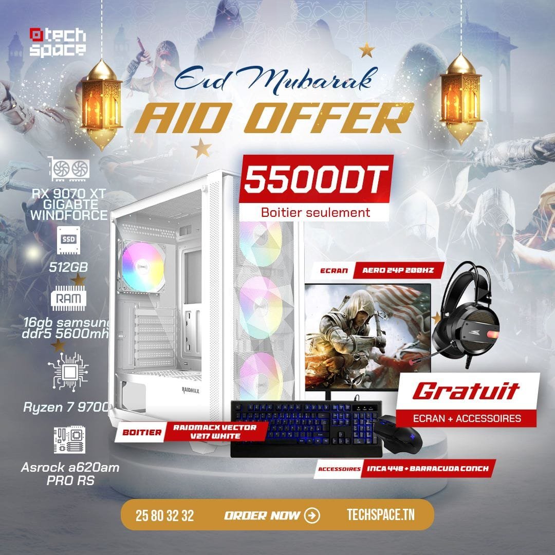 Vivez une expérience gaming exceptionnelle durant cette période de l’Aid. Équipé d’un processeur Ryzen 7 9700, de la puissante carte graphique Gigabyte RX 9070 XT Windforce et d’une carte mère ASRock A620M pro rs , ce setup offre une fluidité parfaite pour vos titres compétitifs favoris. Le boitier RAIDMAX V217 WHITE et l’écran AERO inclus en font la configuration idéale pour faire la fête.